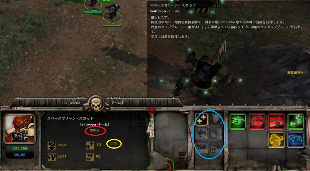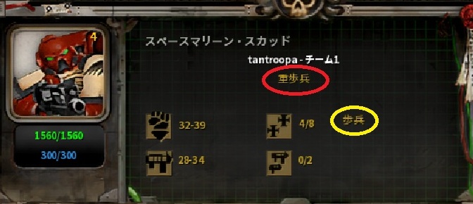 これはスペースマリーン・スカッドの表示です。ユニットにカーソルを合わせると、上にそのユニットの概要情報が表示されます。ユニット部分を、ちょっと拡大します。