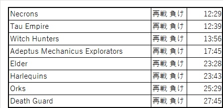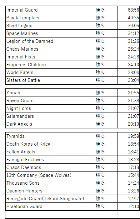 ちなみに、その中でもSpaceMarineより上は粘り強い、最後に攻めるのに時間がかかったというところもあり、序盤有利をとれないと負けていた可能性もあります。