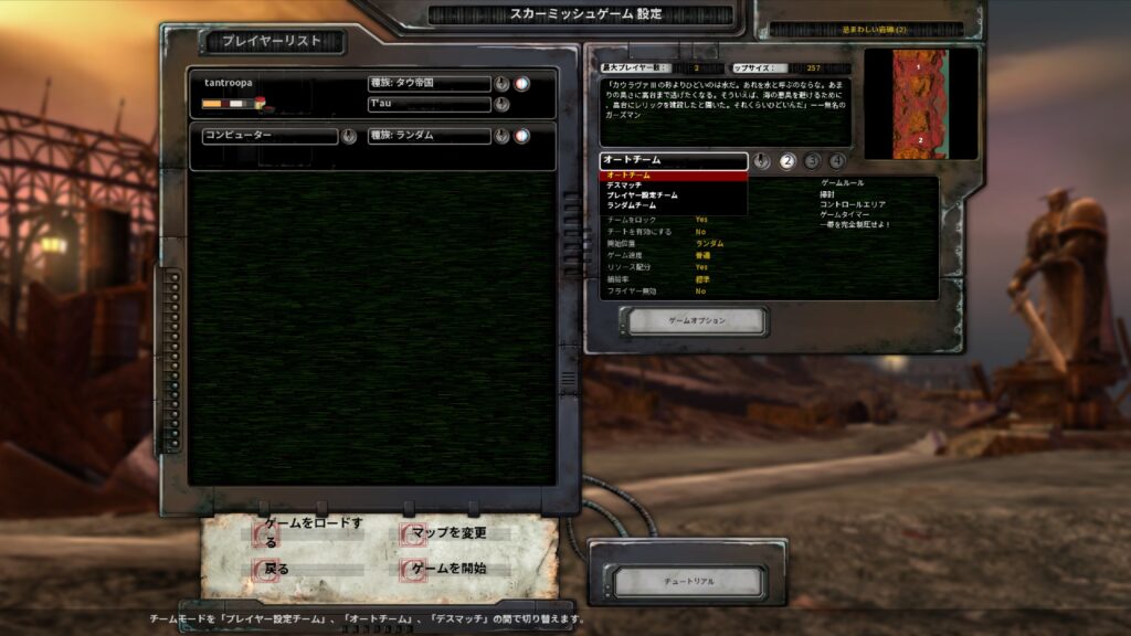 「ランダムチーム」基本オートチームと一緒ですが、オートチームの場合、マップの両端に2つづつだときちんと2つが同じ陣営になるように決めてくれるのですが、こちらはランダムです。離れているとチームプレイにはならないので、どちらかというとオートチームを使ったほうがいいと思います。対AI戦ならありですが。