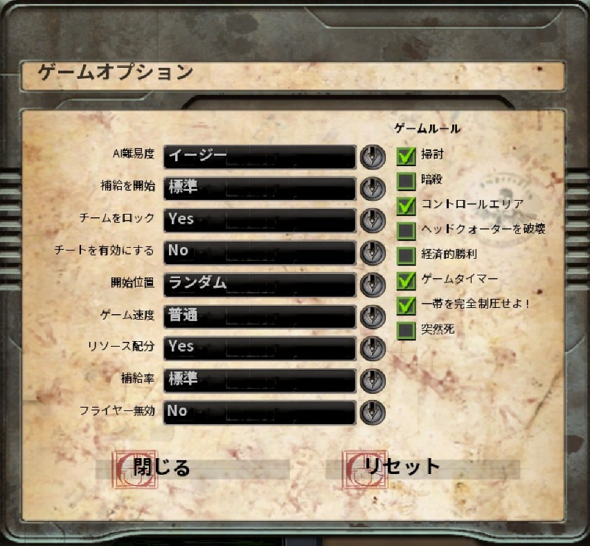 「突然死」はサドンデスですね。一度確保した戦略拠点を取られたら、即終了です。このオプションでやったこと無いですが、やり込むと意外と緊張感のあるゲームになりそうです。ゲーム性は全然変わってきますが。